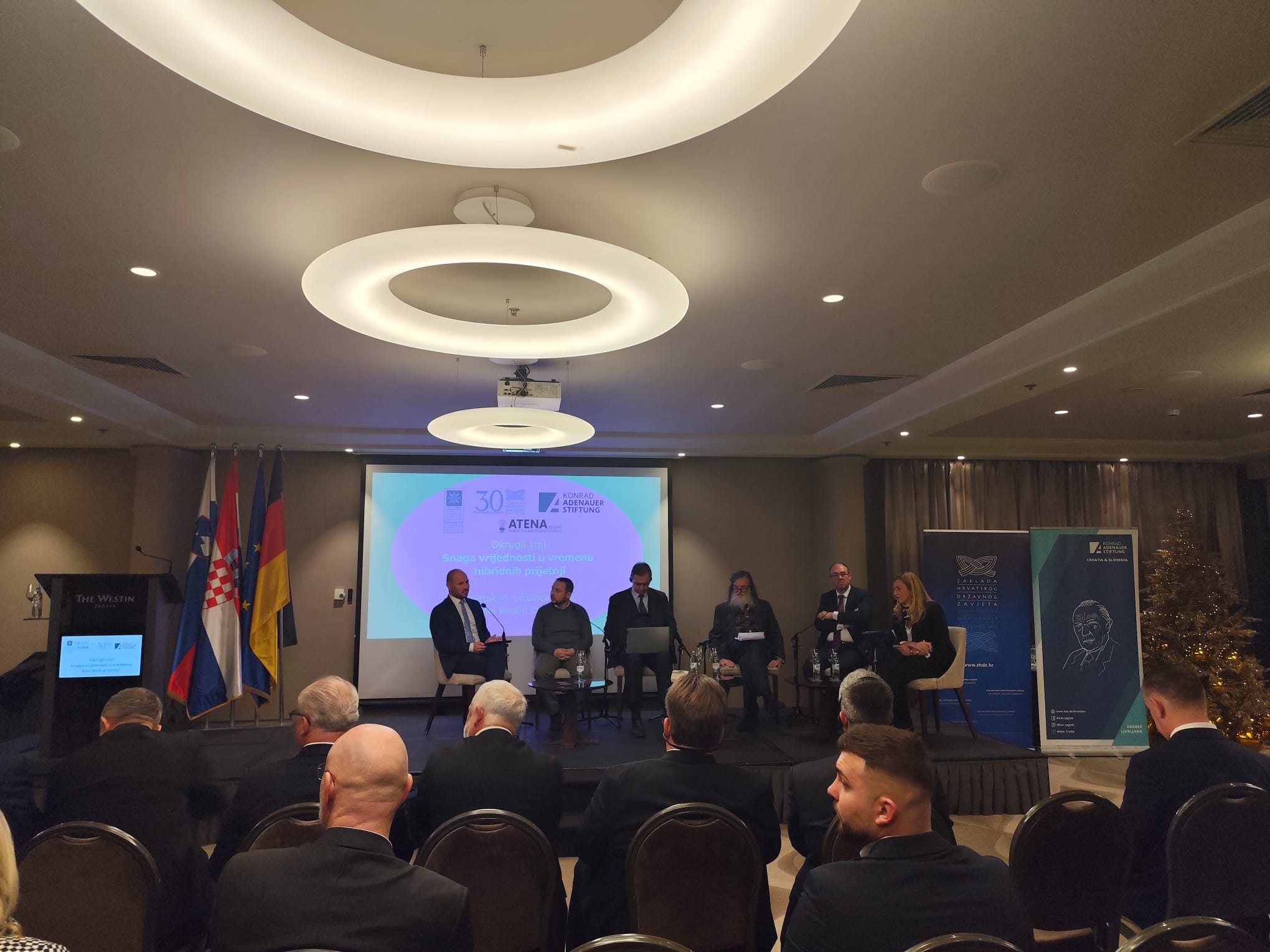Dana 4. prosinca 2025. održan je okrugli stol “Snaga vrijednosti u vremenu hibridnih prijetnji”, u organizaciji Zaklade hrvatskog državnog zavjeta, Zaklade Konrad Adenauer, Hrvatskog katoličkog sveučilišta i Instituta za istraživanje hibridnih sukoba. Događanje je započelo izvedbama Lijepe naše i Ode radosti. Alumnija Političke akademije Marije Hodalj i Nikole Grabara, a Nina Kušen Tomljanović iz Zaklade hrvatakog državnog zavjeta i alumna Političke akademije na početku pozdravila je sve nazočne i moderirala događanje. Ravnatelj Zakladne uprave Zaklade hrvatskog državnog zavjeta Srećko Prusina u uvodnom govoru otvorio je temu okruglog stola istaknuvši važnost vrijednosti kroz povijest, ali i njihov značaj za budućnost. Voditelj ureda Zaklade Konrad Adenauer Stiftung za Hrvatsku i Sloveniju, Norbert Eschborn u svom je obraćanju naglasio utjecaj vrijednosti na društvo i svakodnevni život, osobito u razdoblju prijetnji koje nastoje narušiti temeljne društvene vrijednosti. Govor je održao i ministar unutarnjih poslova Davor Božinović, koji je kroz aktualne primjere upozorio na prijetnju dezinformacija. Istaknuo je kako dezinformacije potkopavaju temeljne vrijednosti društva, ponajprije povjerenje u institucije i demokratske procese, često radi političkog oportunizma i poticanja društvenih podjela. Naglasio je važnost obrazovanja u borbi protiv dezinformacija te cilj jačanja povjerenja u institucije i očuvanja demokracije. Na isto se nadovezao prof. dr. sc. Željko Tanjić, rektor Hrvatskog katoličkog sveučilišta , istaknuvši važnost katoličkog odgoja i obrazovanja koji čine temelj ne samo hrvatskih, već i europskih vrijednosti, te važnost društva koje njeguje povjerenje, dijalog, ljudsko dostojanstvo i zajednički moralni kompas. Glavno izlaganje prije panel rasprave održao je dr. Gordan Akrap,predsjednik i osnivač Instituta za istraživanje hibridnih sukoba i prorektor Sveučilišta obrane i sigurnosti Dr. Franjo Tuđman, koji je kroz različite povijesne primjere objasnio kako prepoznati dezinformacije. Naglasio je da neistiniti medijski naslovi, javni govori i agresivno etiketiranje doprinose podjelama u društvu te potkopavaju demokraciju i njezine vrijednosti. Panel raspravu otvorila je moderatorica Lucija Pranjić sa Sveučilišta obrane i sigurnosti „Dr. Franjo Tuđman“. Prvo pitanje bilo je upućeno predsjedniku stranke Nova Slovenija Jerneju Vrtovecu, koji se osvrnuo na širenje dezinformacija u Sloveniji i društvene podjele koje nastaju agresivnim etiketiranjem desnih stranaka. Profesor Julian Chifu s Nacionalne obavještajne akademije u Rumunjskoj govorio je o problemima prošlogodišnjih izbora u Rumunjskoj i Moldaviji, koji su zbog širenja dezinformacija u nekim slučajevima bili i poništeni. Naglasio je kako se u suvremeno doba informacije sve češće koriste kao sredstvo ratovanja. Profesor Marco Lobardi s Katoličkog sveučilišta u Milanu istaknuo je da je cilj širenja dezinformacija utjecaj na javno mnijenje i poticanje društvenih podjela. Upozorio je koliko je taj proces olakšan digitalnim okruženjem te predložio jačanje stručnih kapaciteta u ovom području. Dr. sc. Roman Domović iz Instituta za istraživanje hibridnih sukoba produbio je temu navodeći primjere korištenja dezinformacija u vrijeme stvaranja hrvatske države, istaknuvši ključne obrasce i aktere. Na kraju, zastupnik u Europskom parlamentu Davor Ivo Stier govorio je o krizi demokršćanskih vrijednosti i njezinu utjecaju na suvremeno društvo. Upozorio je da današnje demokracije teško pronalaze odgovore na tu krizu te pozvao na iznalaženje rješenja koja će ponovno istaknuti važnost i svrhu demokršćanske demokracije. Događaj je zaključio Norbert Eschborn, izrazivši nadu u buduću suradnju i pozitivne pomake.